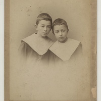 Слева - Осип, рядом - Александр. Фотография на фирменном паспарту. На обороте черными чернилами рукой Ф.О. Мандельштам: 5677 Дорогой птичке посылает / своих птенцов горячо любящий / ее друг Флора / С. Петербург / 22-го Декабря 1899 г.