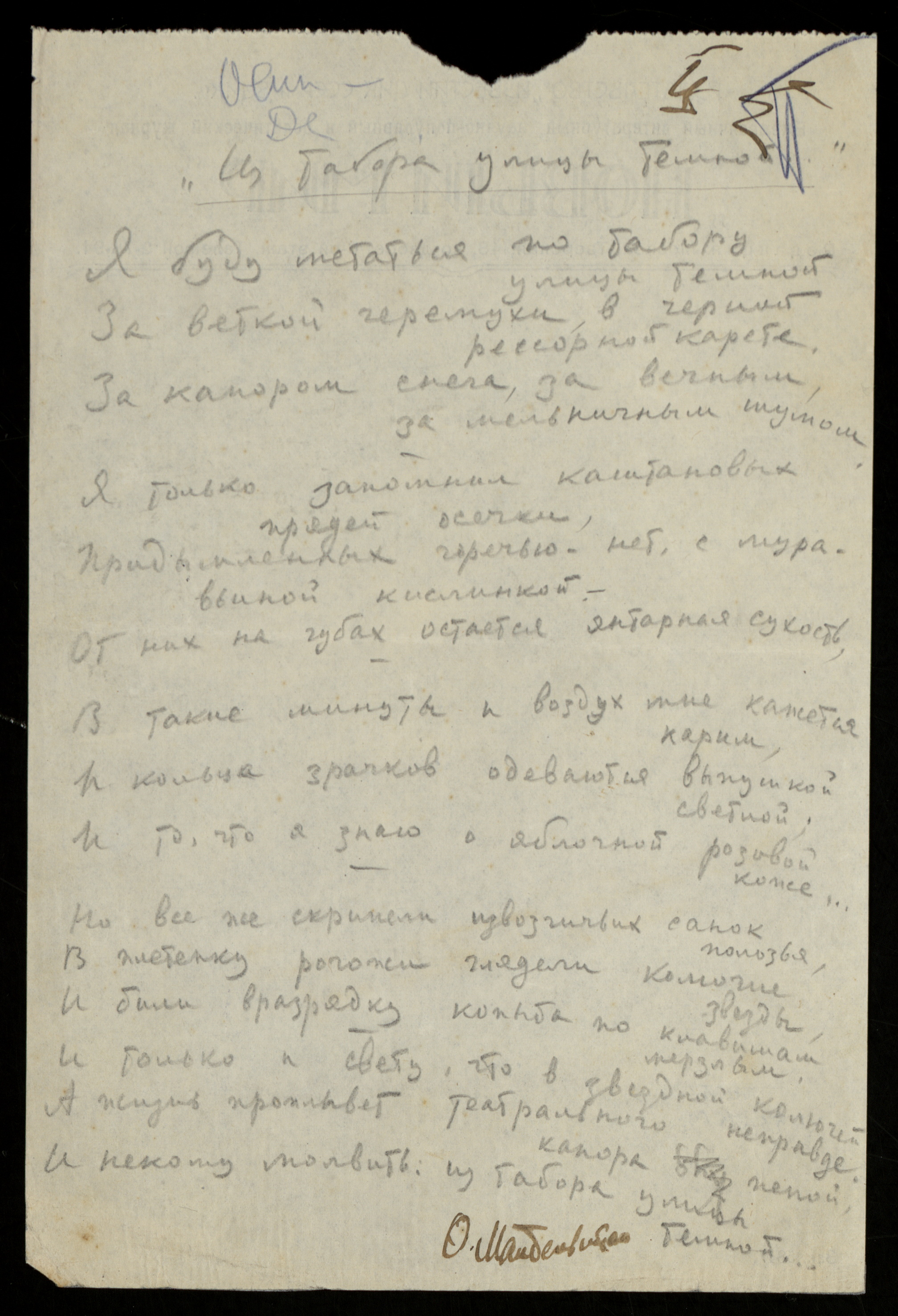 → → Фонды Морешет «Из табора улицы темной...». Стихотворение На обороте бланка журнала «Новый мир». Сюжет Литература, Книгоиздание Этно-территориальный рубрикатор Ашкеназы Автор Мандельштам Осип Эмильевич Период создания [1927] Материал, техника Бумага, Автограф, Карандаш, Чернила коричневые Размеры 20,5 х 13,5 см Правообладатель Государственный музей истории российской литературы имени В. И. Даля Номер в Госкаталоге 5484888 Входит в выставки Улица Мандельштама: Осип и Надежда