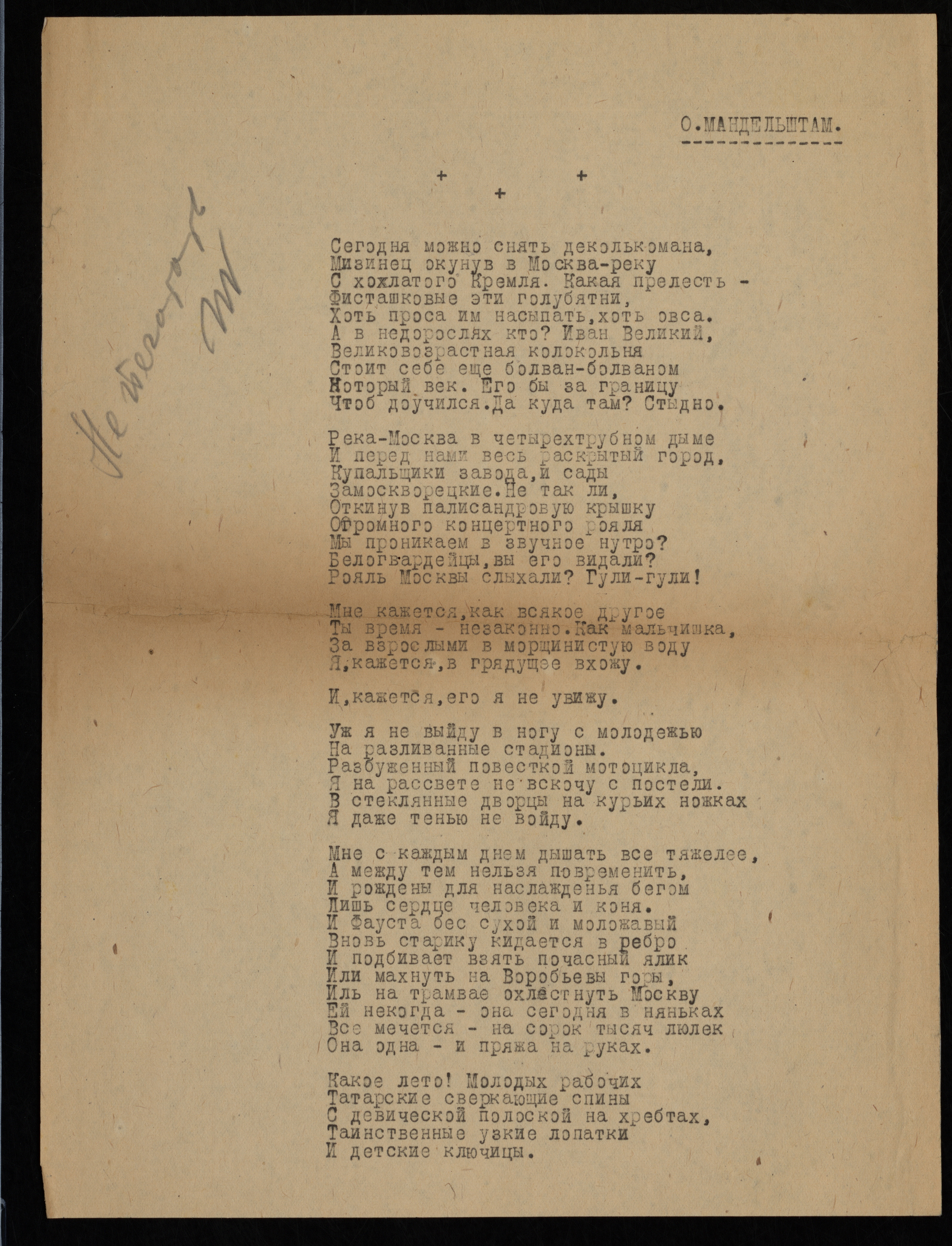 → → Фонды Морешет «Сегодня можно снять декалькомана...». Стихотворение На л. 1 слева помета С.Б. Ингулова: «Не печатать». Сюжет Литература, Книгоиздание Этно-территориальный рубрикатор Ашкеназы Автор Мандельштам Осип Эмильевич Период создания [1931] Материал, техника Бумага, Машинопись, Автограф, Карандаш Размеры 28,9 х 21,7 см Правообладатель Государственный музей истории российской литературы имени В. И. Даля Номер в Госкаталоге 58159250 Входит в выставки Улица Мандельштама: Осип и Надежда