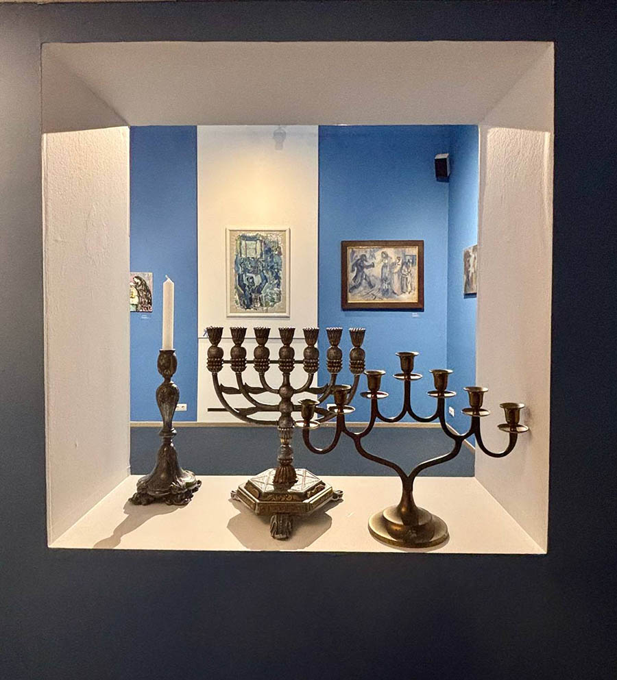 → → Фрагмент экспозиции «Местечко на Фонтанке. От Шагала до современности». Дизайн – Валерий Полуновский. KGallery. Санкт-Петербург. 2025. Фото: Евг. Гершкович, А. Голубовский