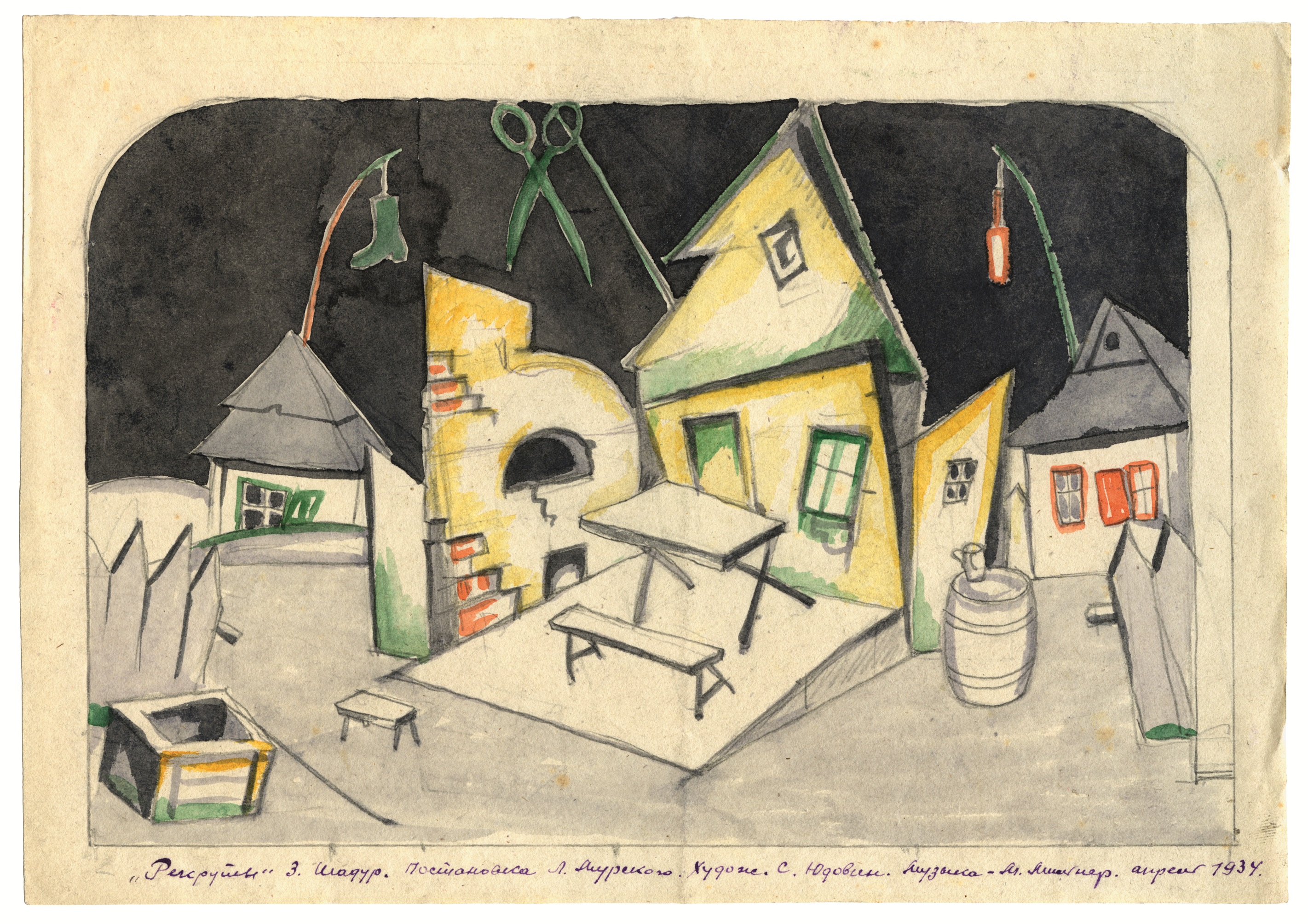 → → Фонды Морешет Эскиз к спектаклю «Рекруты» (Театральная мастерская под руководством Л. И. Мурского при Евдомпросвете им. Я. Свердлова. Премьера в апреле 1934) Сюжет Изобразительное искусство, Традиция, Идентичность, Театр Этно-территориальный рубрикатор Ашкеназы Автор Соломон Юдовин Период создания 1934 Материал, техника Бумага, Акварель, Карандаш Размеры 17 × 26,2 Правообладатель Собрание Еврейского общинного центра, Санкт-Петербург Входит в выставки Местечко на Фонтанке. От Шагала до современности