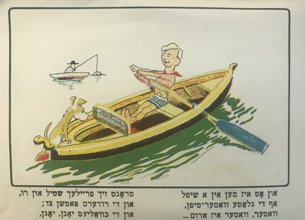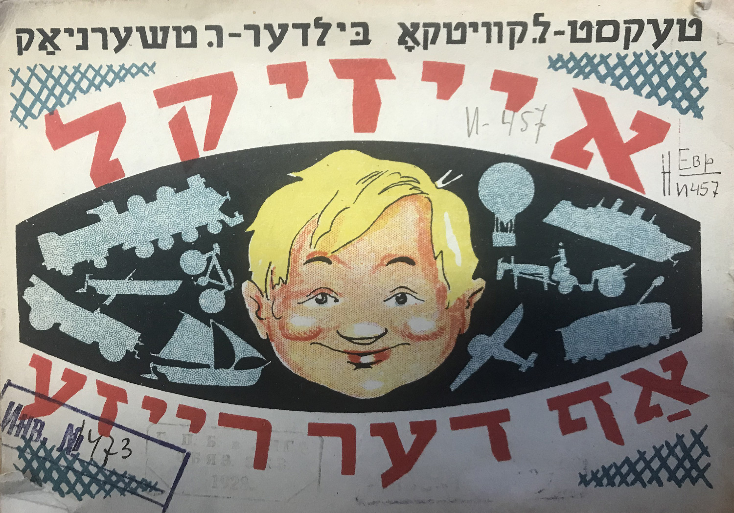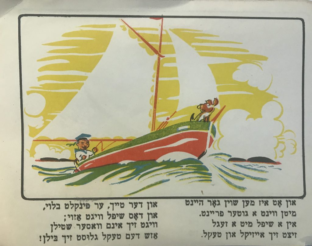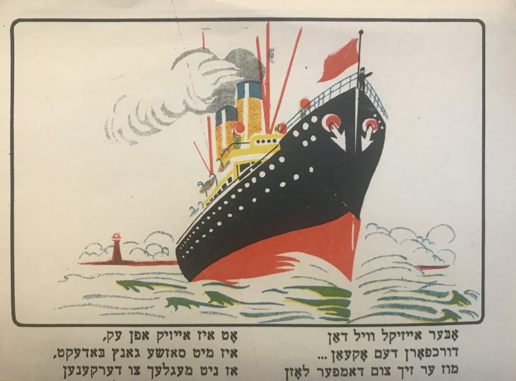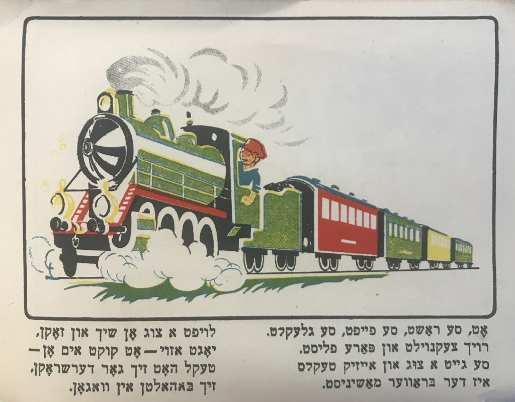 Выходные данные: Квитко Л. Айзикл аф дер райзе (Айзик в путешествии). Художник Р. Черняк. Харьков — Киев: Центрфарлаг – Культура, 1928