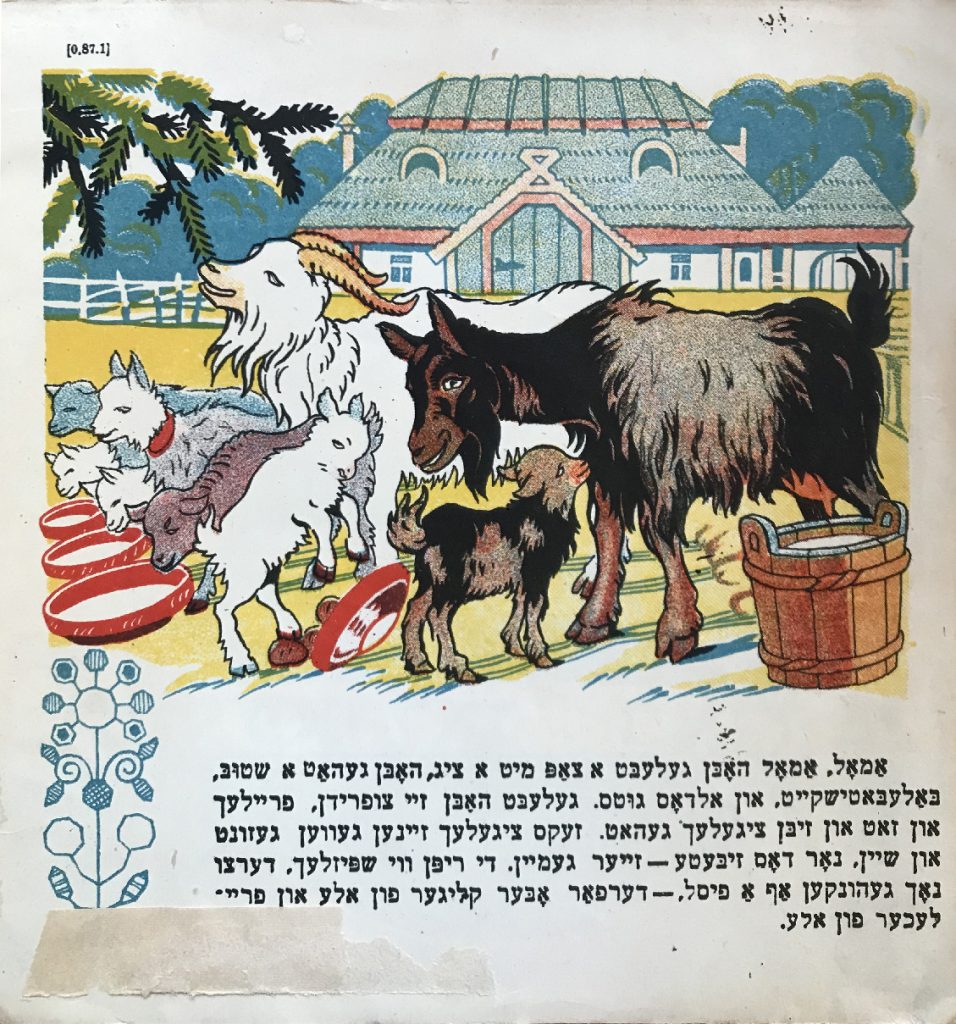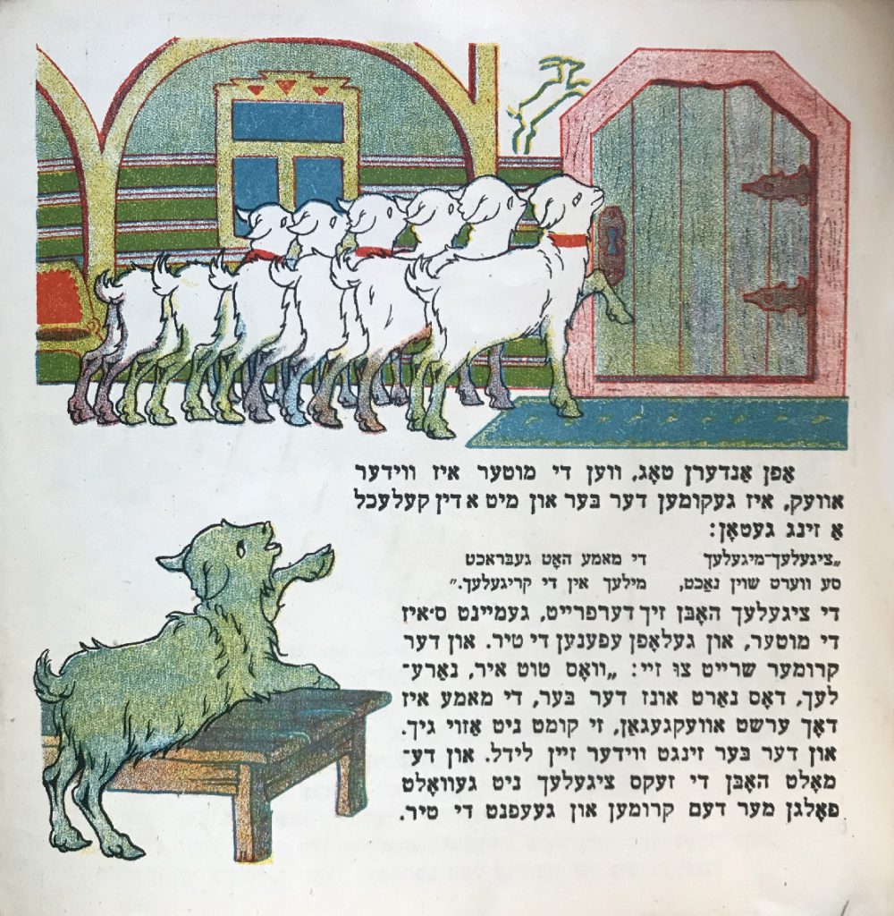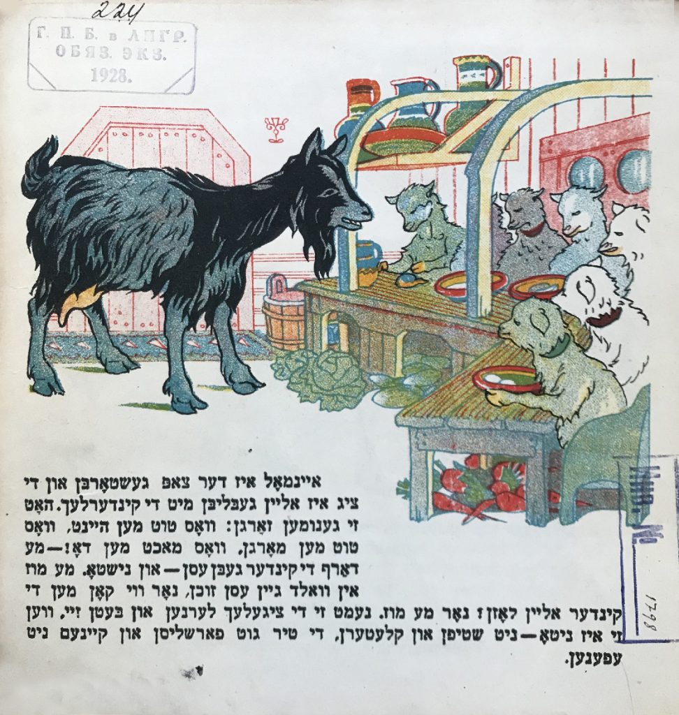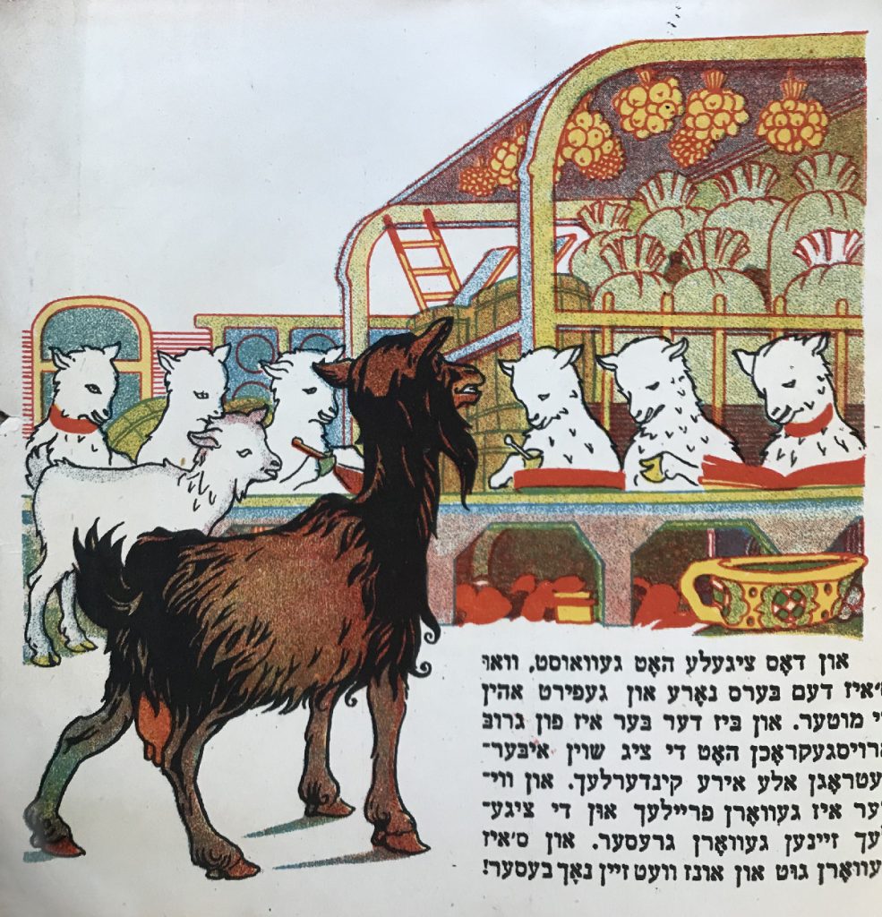 Выходные данные: Квитко Л. А циг мит зибн цигелех (Коза с семью козлятами). Художник О. Судомора. Харьков — Киев: Центрфарлаг – Культура, 1928