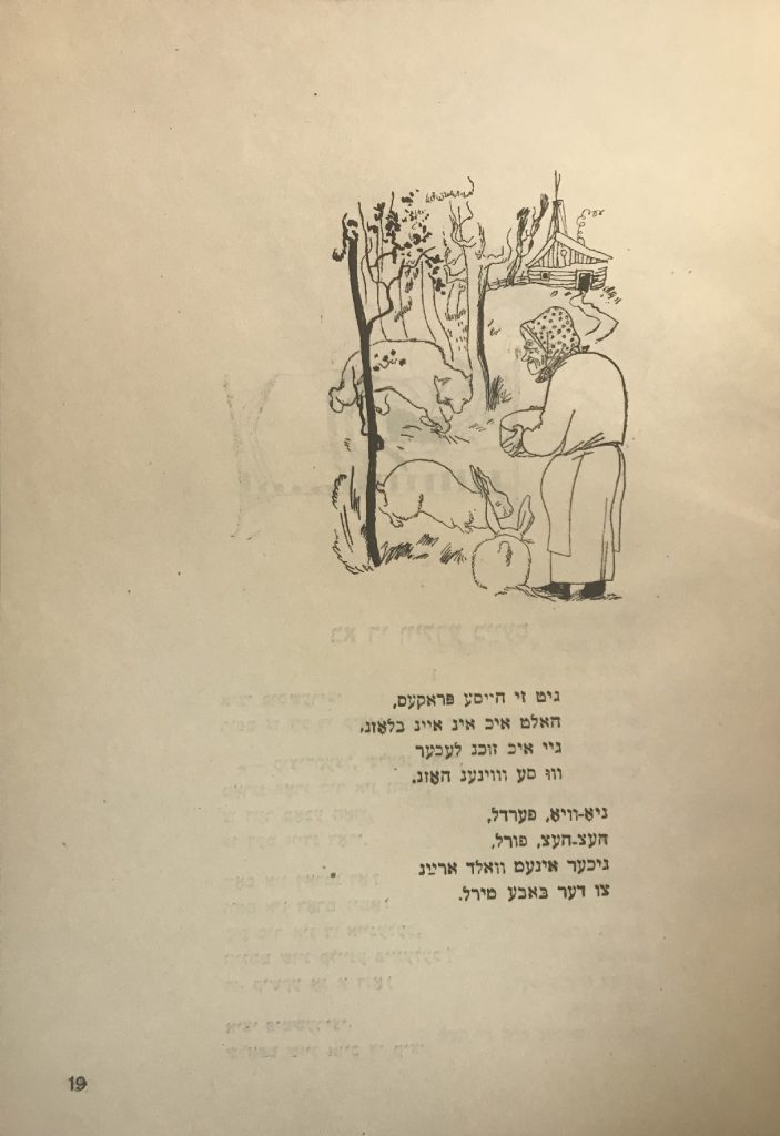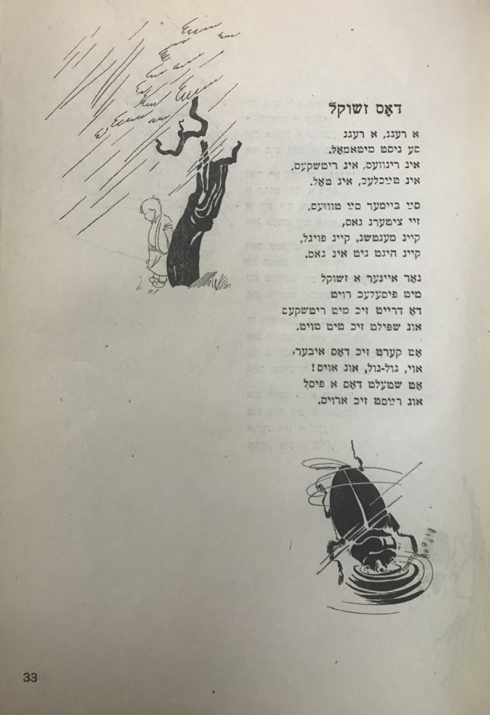 Выходные данные: Квитко Л. Фар ди киндерсвегн (Для детей). Художник А. Короткин. М.: Эмес, 1933