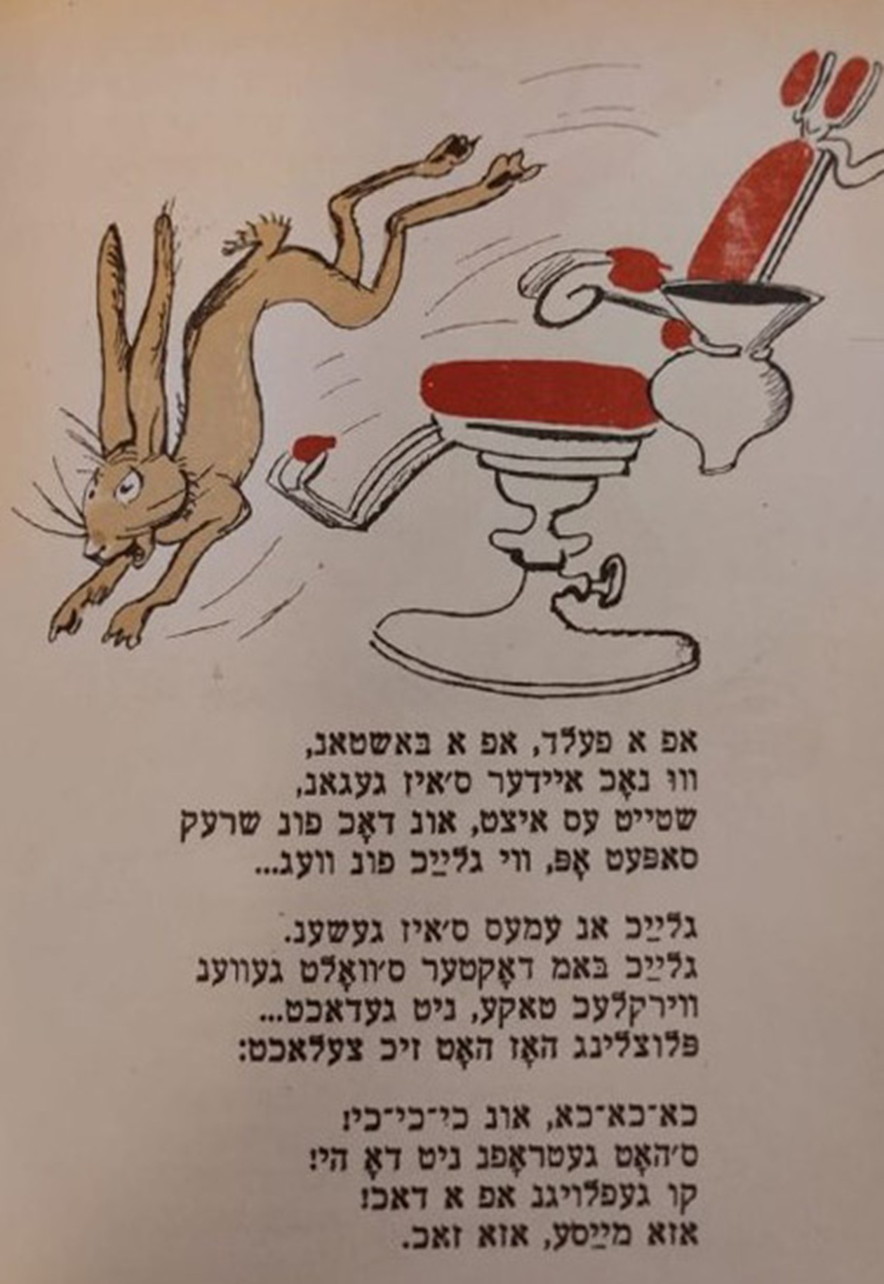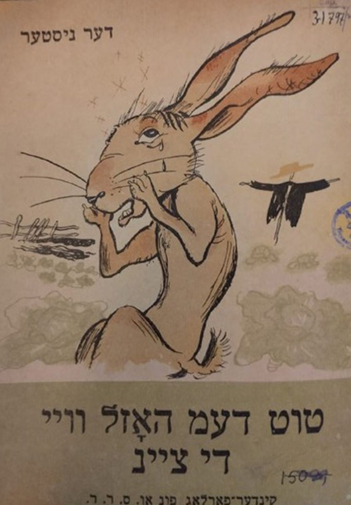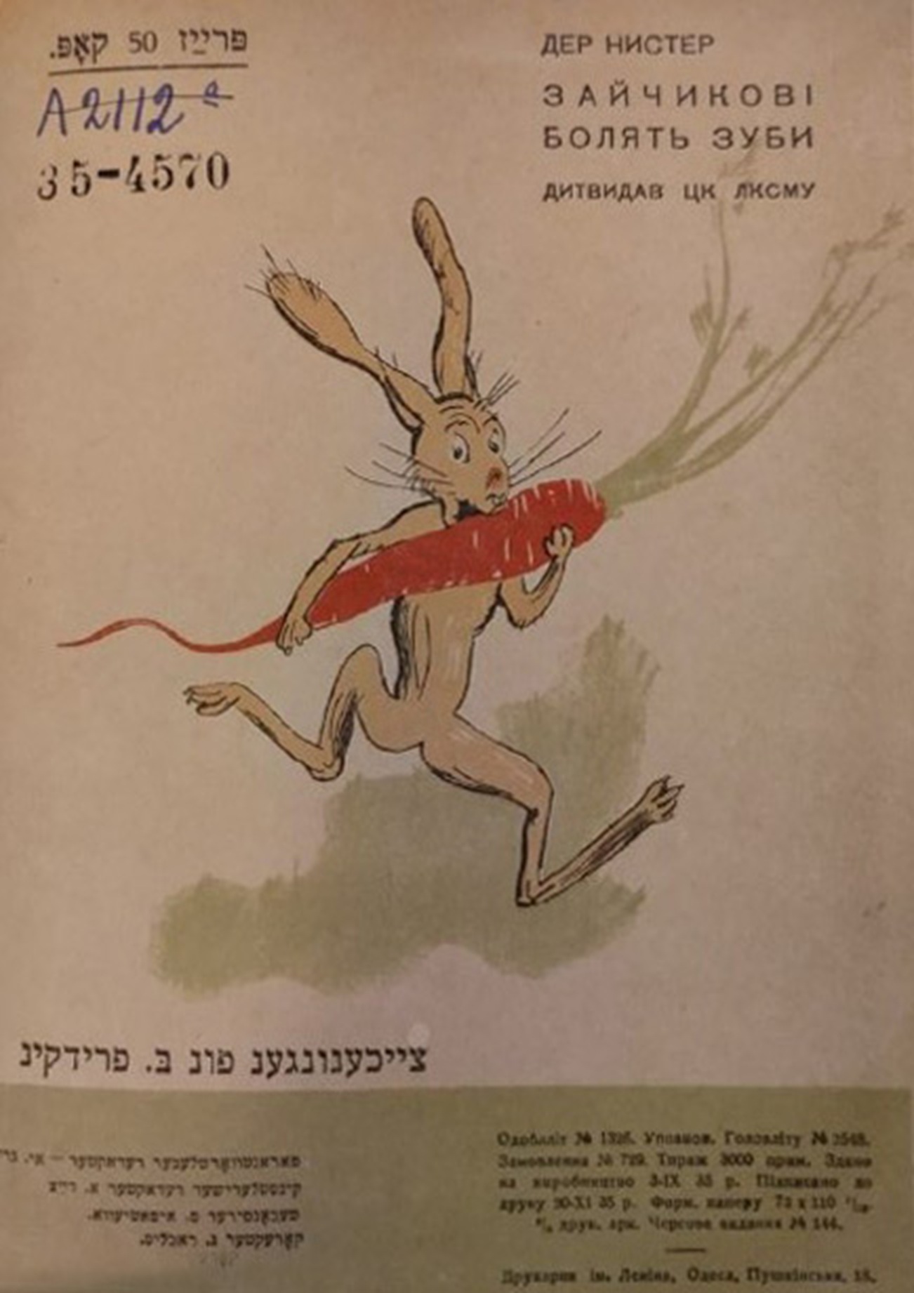 Фонды Морешет Дер Нистер. Болят у зайки зубы Выходные данные: Дер Нистер. Болят у зайки зубы. Художник Б. Фридкин. Одесса: Детиздат ЦК ЛКСМУ, 1935 Автор Фридкин Борис Период создания 1935 Правообладатель Российская национальная библиотека, Санкт-Петербург, Ассоциация исследователей еврейской культуры «Петербургская иудаика» Входит в выставки Еврейская иллюстрированная книга в СССР. 1920-30-е годы Ссылка Страница на сайте «Петербургской иудаики»