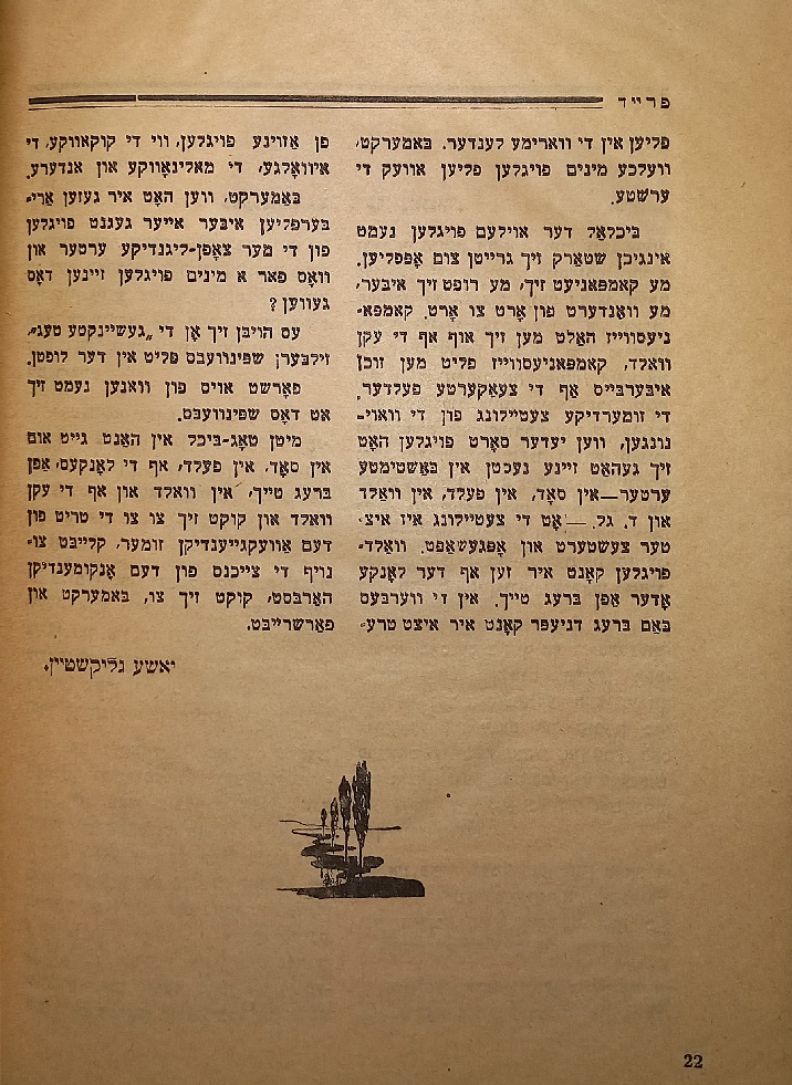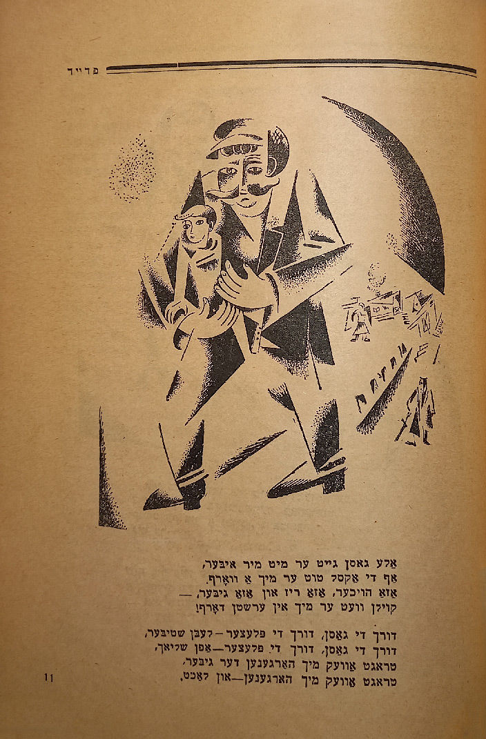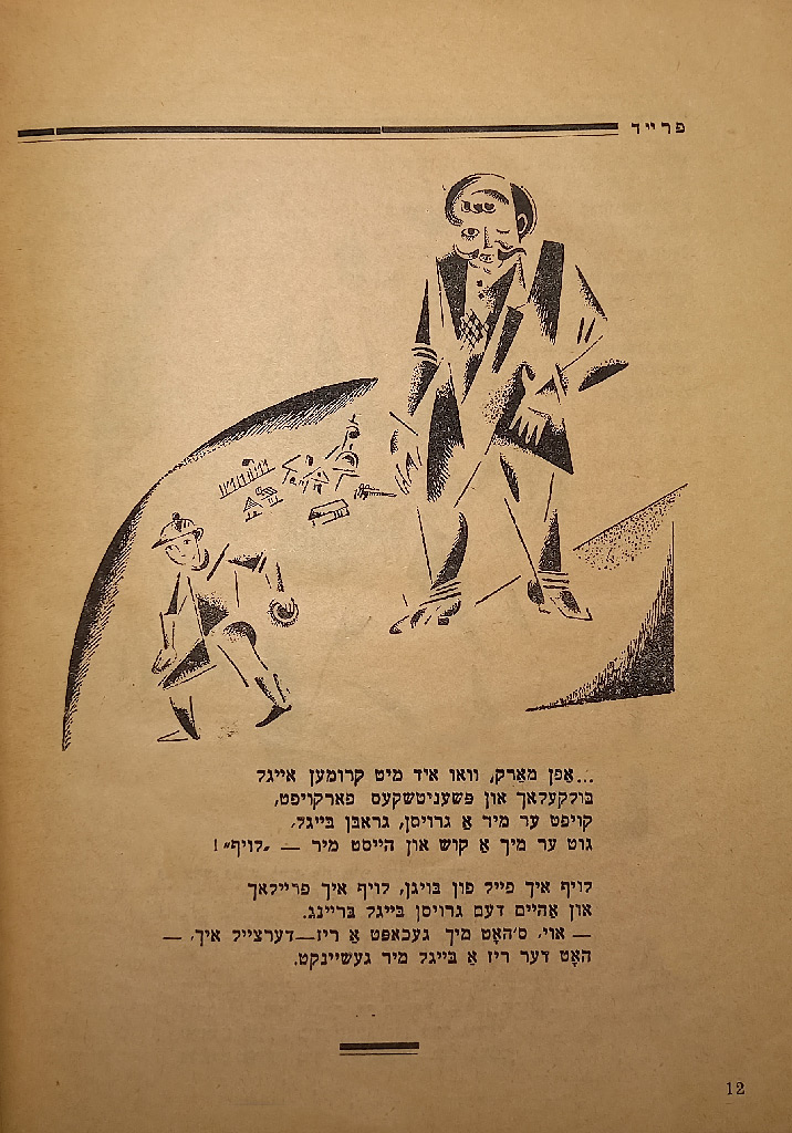 Фонды Морешет Радость. Выпуск 8 Выходные данные: Фрейд (Радость). Киев: Культур-Лиге. Выпуск 8 (июль 1923) Описание Выпуск содержит произведение «А майсе мит а риз (Сказка про великана)» Эзры Фининберга. Автор Эпштейн Марк Период создания 1923 Правообладатель Российская национальная библиотека, Санкт-Петербург, Ассоциация исследователей еврейской культуры «Петербургская иудаика» Входит в выставки Еврейская иллюстрированная книга в СССР. 1920-30-е годы