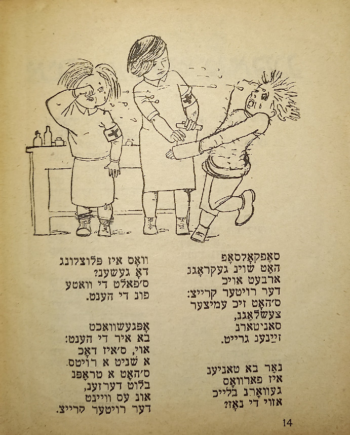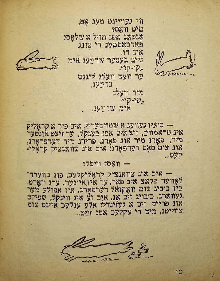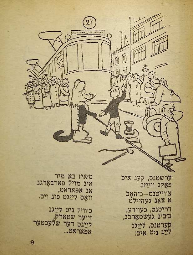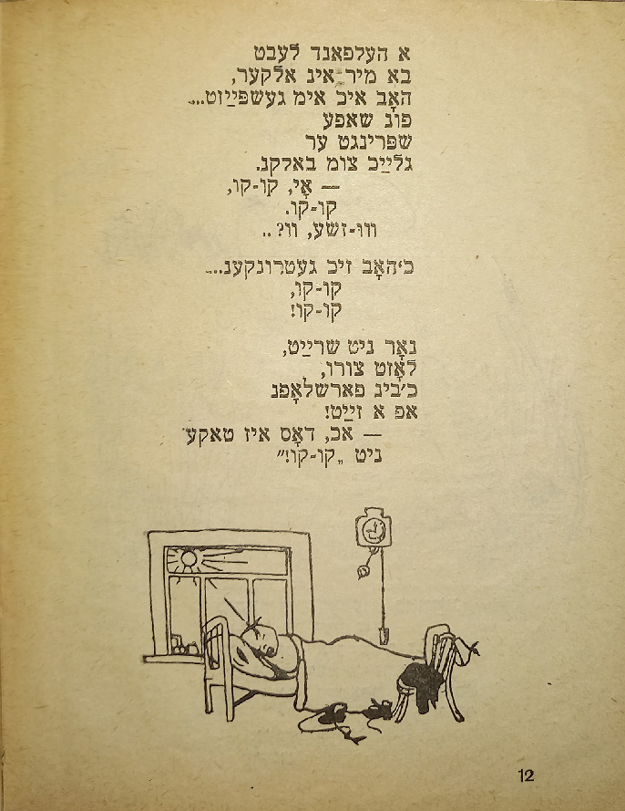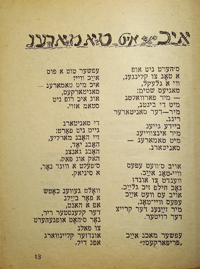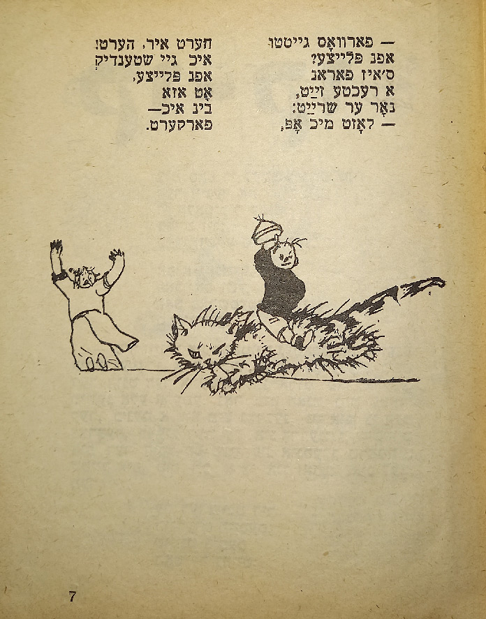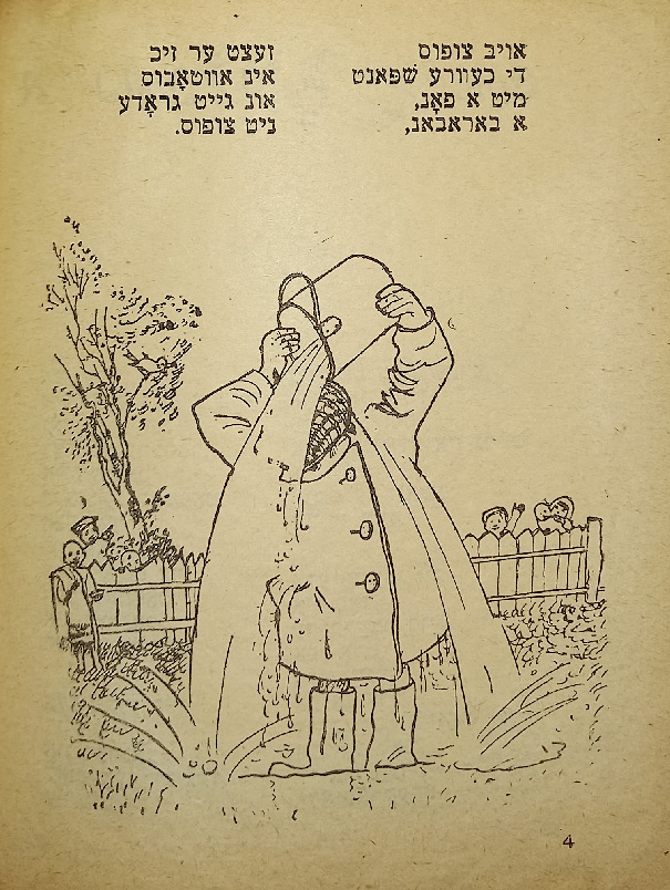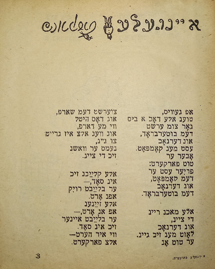 В стихотворении «Ингеле фаркерт (Мальчик наоборот)» слово «наоборот» написано вверх ногами. В сборник входят такие стихотворения, как «Ку-ку», «Их мит Тамарен (Мы с Тамарой)», «Плаплерн (Болтунья)».