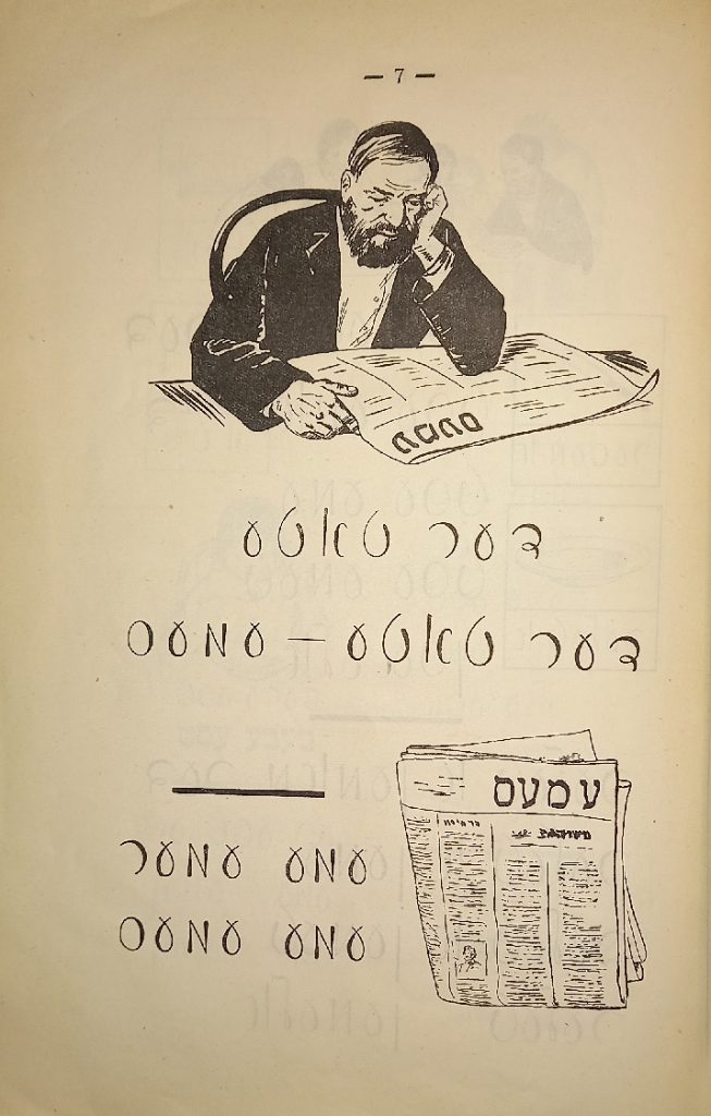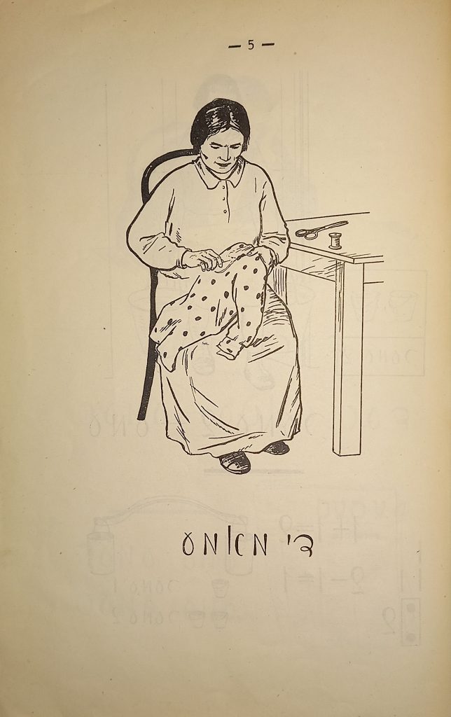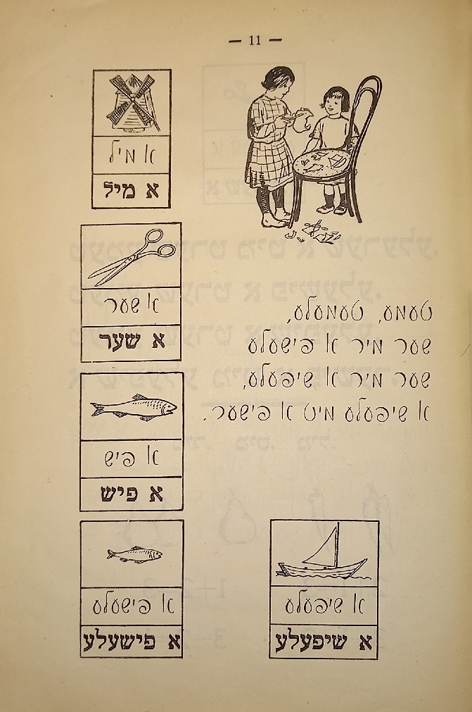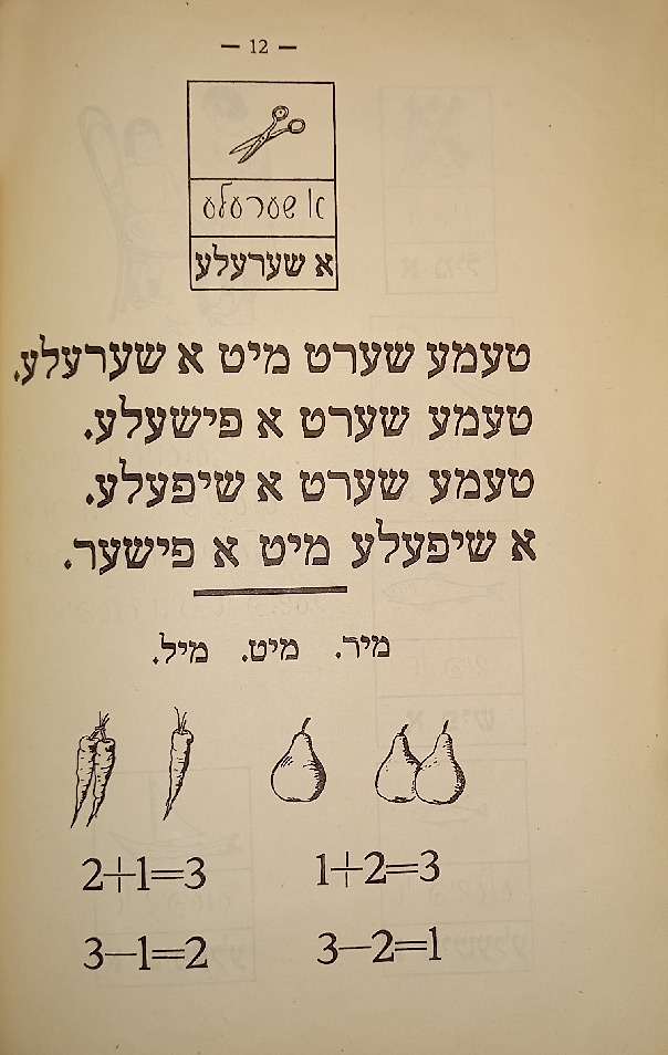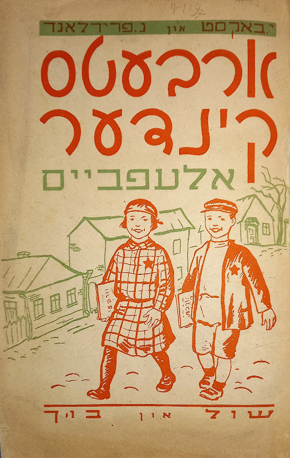 Выходные данные: Бакст И., Фридланд Н. Арбетс-киндер: Алефбейс (Дети труда: Букварь). Художник М. Муцельмахер. М.: Шул ун бух, 1927