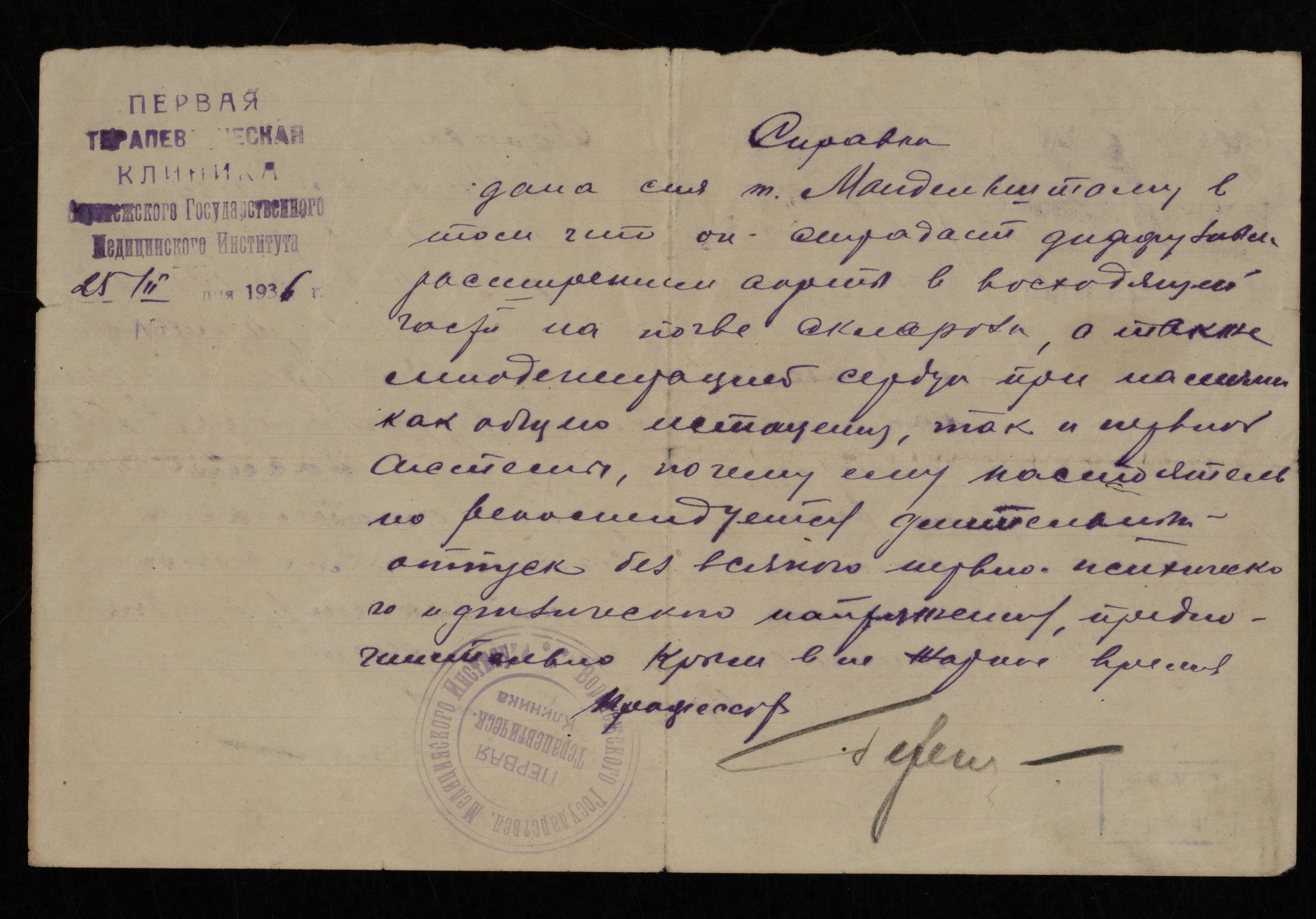 Справка о состоянии здоровья О.Э. Мандельштама, выданная Первой терапевтической клиникой Воронежского государственного медицинского института Изучить экспонат